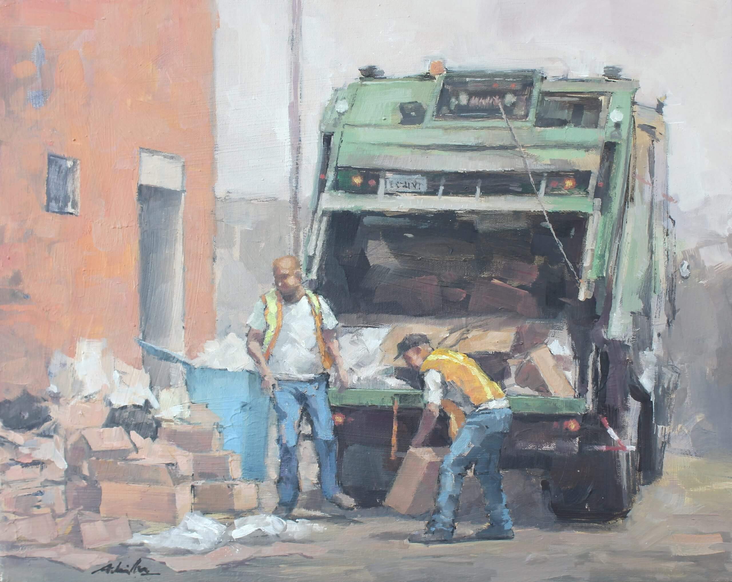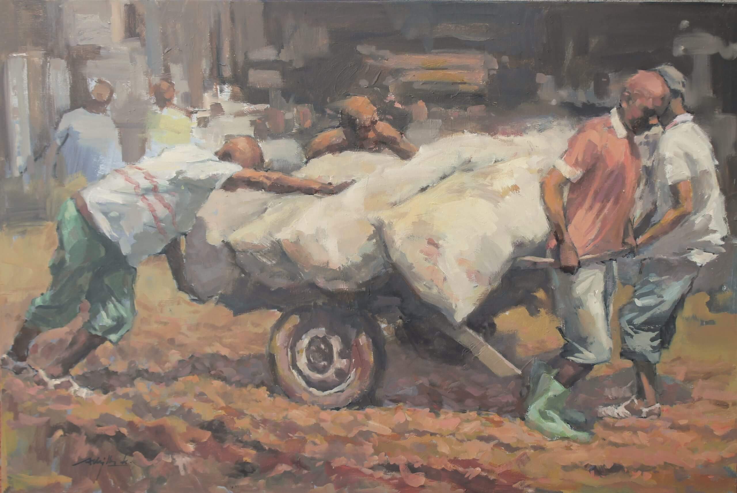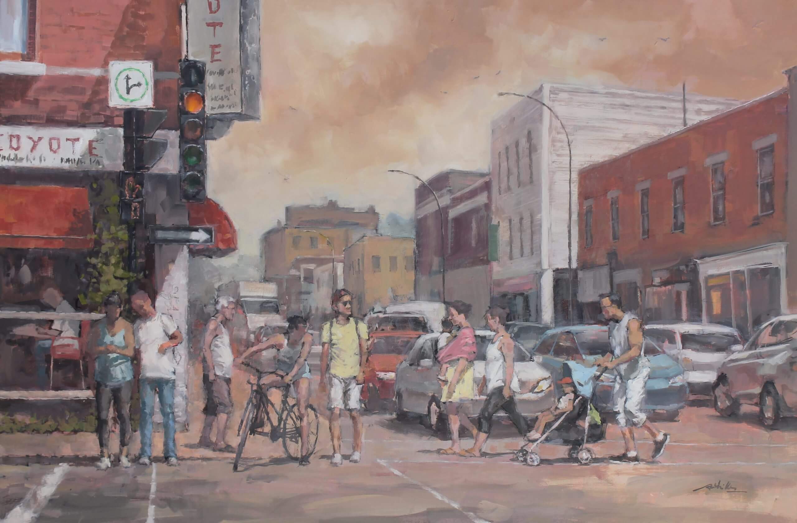 Les bidonvilles, les scènes urbaines d’Afrique, du Canada et d’ailleurs, thèmes moteur de sa gestuelle picturale, lui offrent à foison des personnages, des objets, des grafitis; des couleurs surtout.