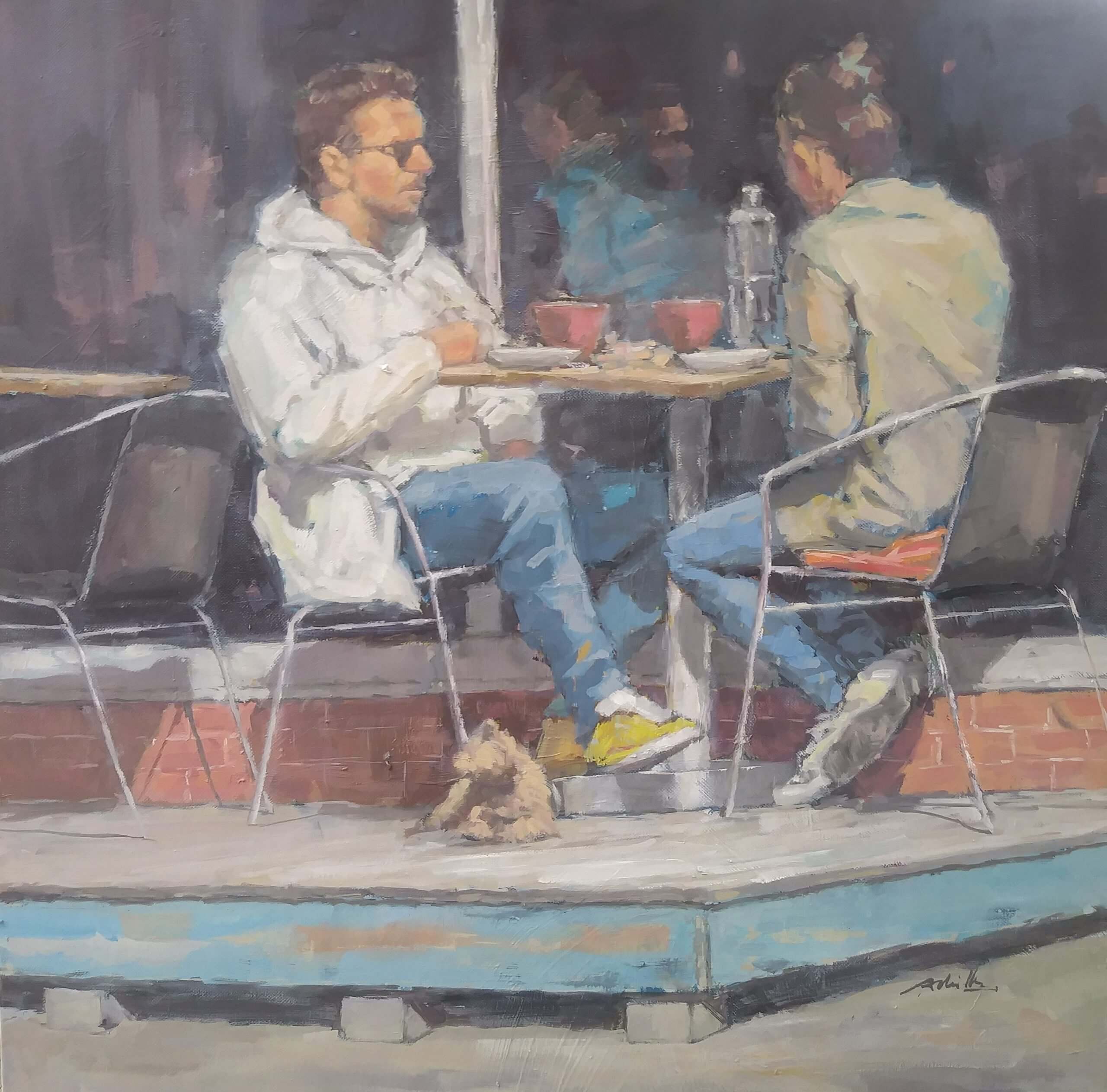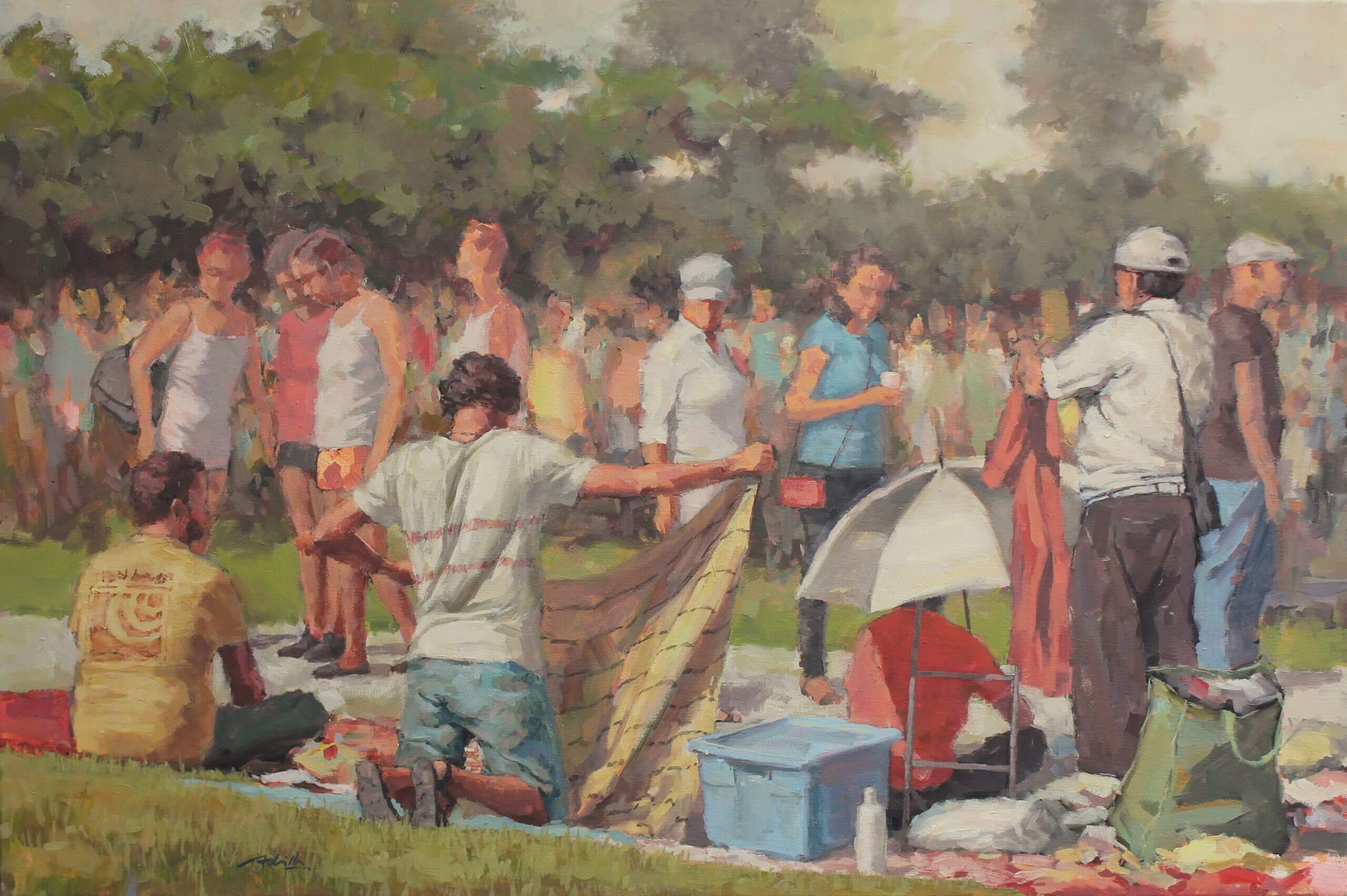 Cependant, il rompt avec l’approche photographique attendue grâce à la particularité de sa technique d’écriture qui castre tout éclat lumineux. En effet, il refuse à faire pétiller sa peinture à l’huile. Cette dernière est traitée selon un art, dont il garde le secret, qui donne à sa touche des teintes mates à forte teneur de vieilli.